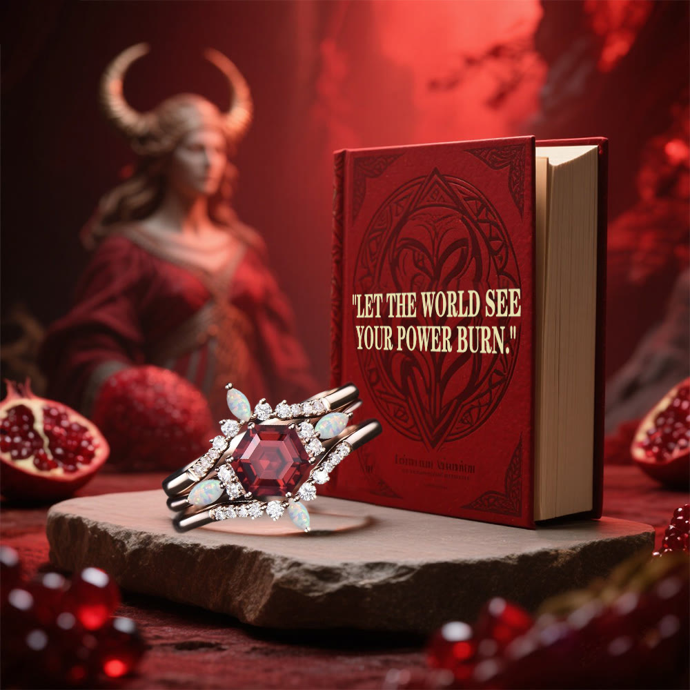 Inspired by the Vanir goddess Freya, this radiant ring embodies passion, power, and divine femininity. At its heart blazes a deep garnet-red stone—symbolic of Freya’s fierce love, magic, and warrior spirit—framed by a halo of shimmering diamonds and ethereal opals, like stars dancing across the skies of Vanaheim.