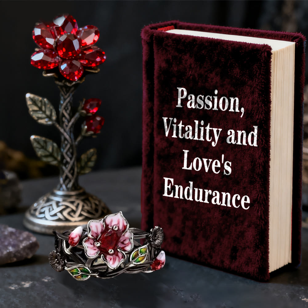 The Mystic Tree Blossom Ruby Ring is a tribute to the sacred Yggdrasil, the great tree that binds the nine realms of Norse legend. At its heart, a blazing ruby blooms like a fiery flower, symbolizing passion, vitality, and resilience. Enamel petals and verdant leaves entwine around the band, echoing the eternal cycle of growth and rebirth.